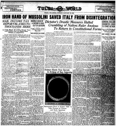 On the inside of the Tulsa Daily World, the article on Mussolini goes on to say that Mussolini and his Black Shirts saved  Italy from a “Red Overthrowal” and that Mussolini had no “Napoleonic ambitions” and was eager to return to “Constitutional Government”.